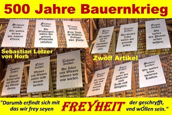 - Die Stadt nimmt das Jubiläum zum Anlass, die historischen Forderungen von Freiheit und Gerechtigkeit neu zu beleuchten: War es im Jahr 1525 der Buchdruck, der Lotzers Zwölf Artikel weit verbreitete, so sind es heute Wort und Bild des Videopodcasts, die seine Ideen in die Gegenwart tragen.