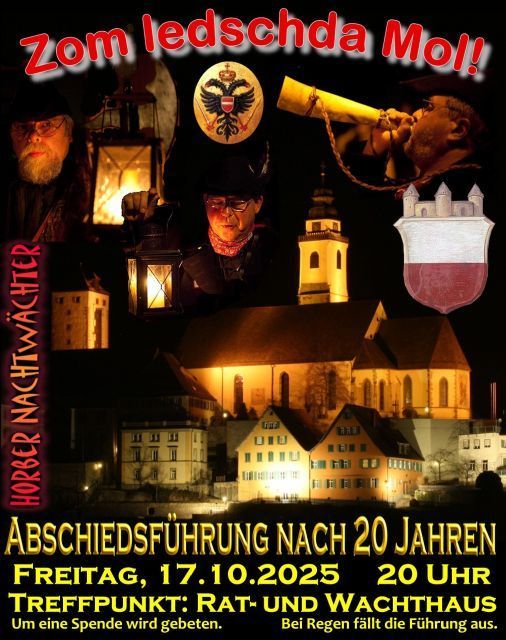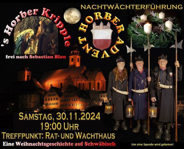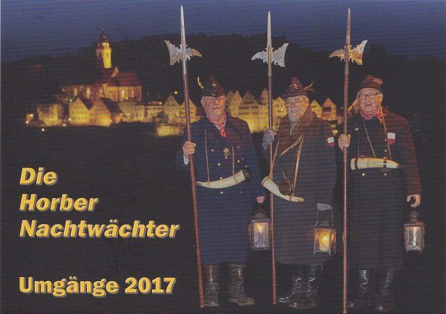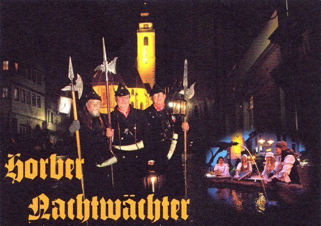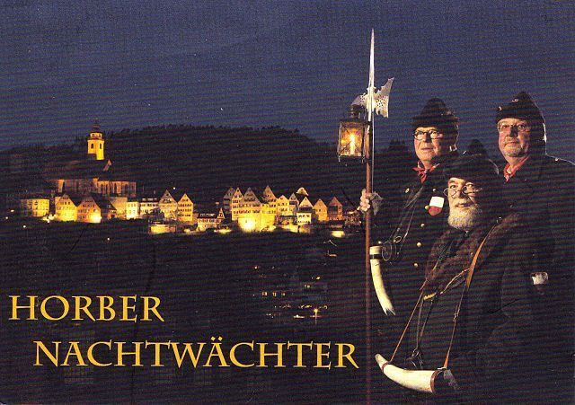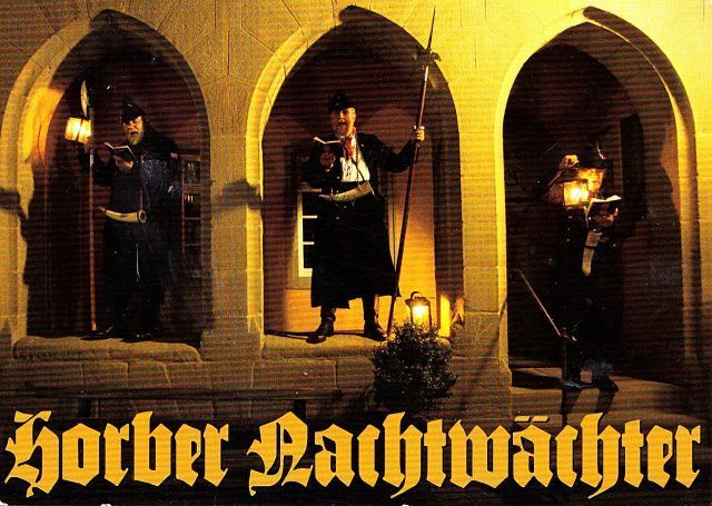 1550 Der Horber Nachtwächtereid wurde ins Stadtbuch geschrieben. Die ummauerte Stadt war in vier Wachten eingeteilt. Die Nachtwache zählte zu den 25 besoldeten Diensten der Stadt, die mit etwa 95 Personen besetzt waren, welche immer nach Weihnachten auf dem Horber Rathaus beim Jahrgericht gewählt wurden. Der Nachtwächterdienst war mit dem Amt des Totengräbers verbunden. Für ein Grab, das "sechs werk schuch tieff" ausgehoben werden musste, betrug der "graberlohn" zweieinhalb Schilling.