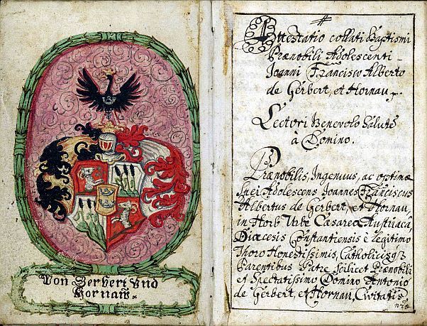 1719 angelegtes Hand- und Reisebuch von Johann Franz Albert von Gerbert und Hornau, ältester Bruder von Fürstabt Martin II. Gerbert